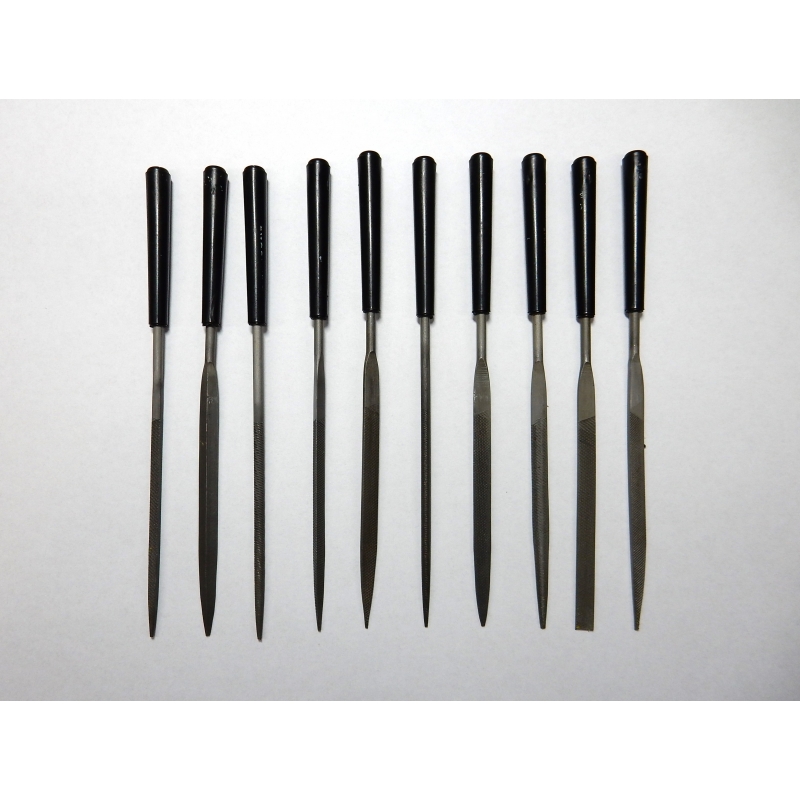 Set de 10 Limes, environ 14mm de long. Idéales pour ébarber vos figurines et retirer les plus grosses lignes de moulage. Plusieurs formes différentes pour atteindre tous les recoins de la figurine, de la maquette ou du décor que vous souhaitez préparer. Ces limes conviennent très bien pour dégrossir rapidement les imperfections des moulages mais pour un rendu parfaitement lisse, nous vous recommandons de terminer la préparation avec du papier de verre ultra fin.