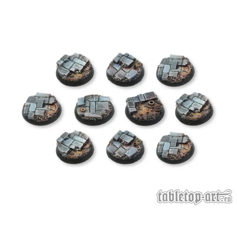 Socles ronds 25mm : Steampunk, vendus non peints. Blister contenant 5 socles en résine pour figurines de taille standard conditionnés aléatoirement parmi les modèles visibles en photo*.