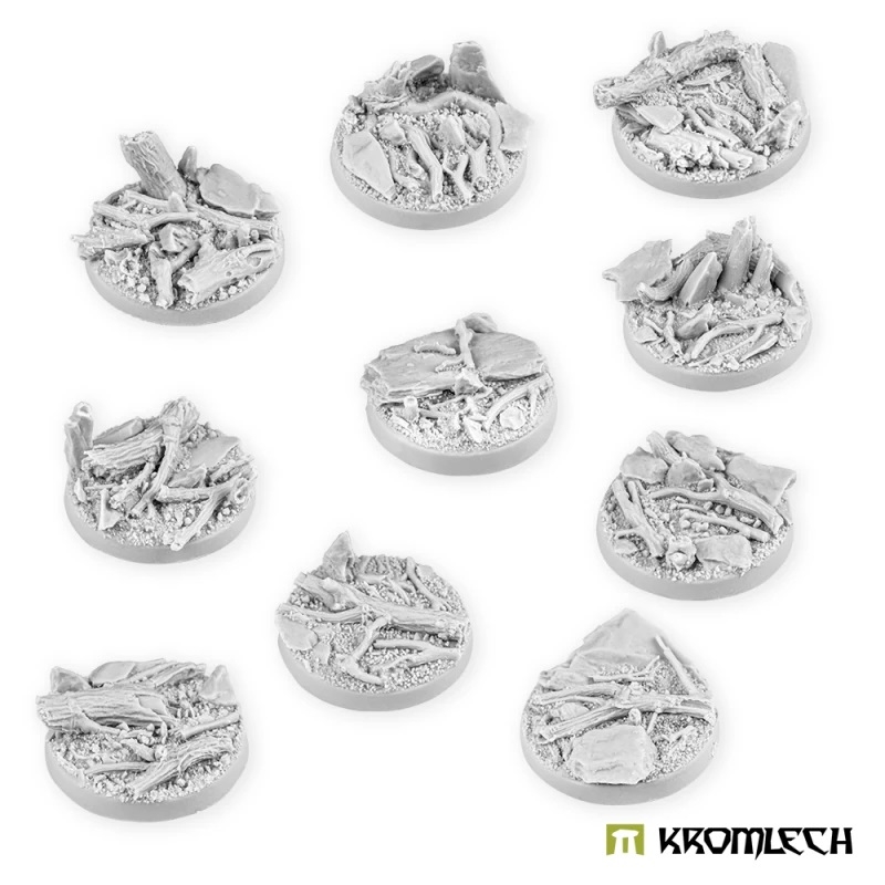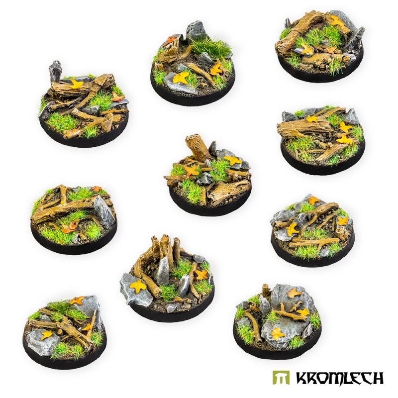 Socles ronds 25mm : Sous bois, vendus non peints. Blister contenant 10 socles en résine conditionnés aléatoirement parmi les modèles visibles en photo*.