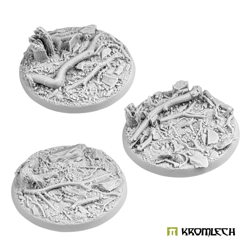 Socles ronds 50mm : Sous bois, vendus non peints. Blister contenant 3 socles en résine conditionnés aléatoirement*.
